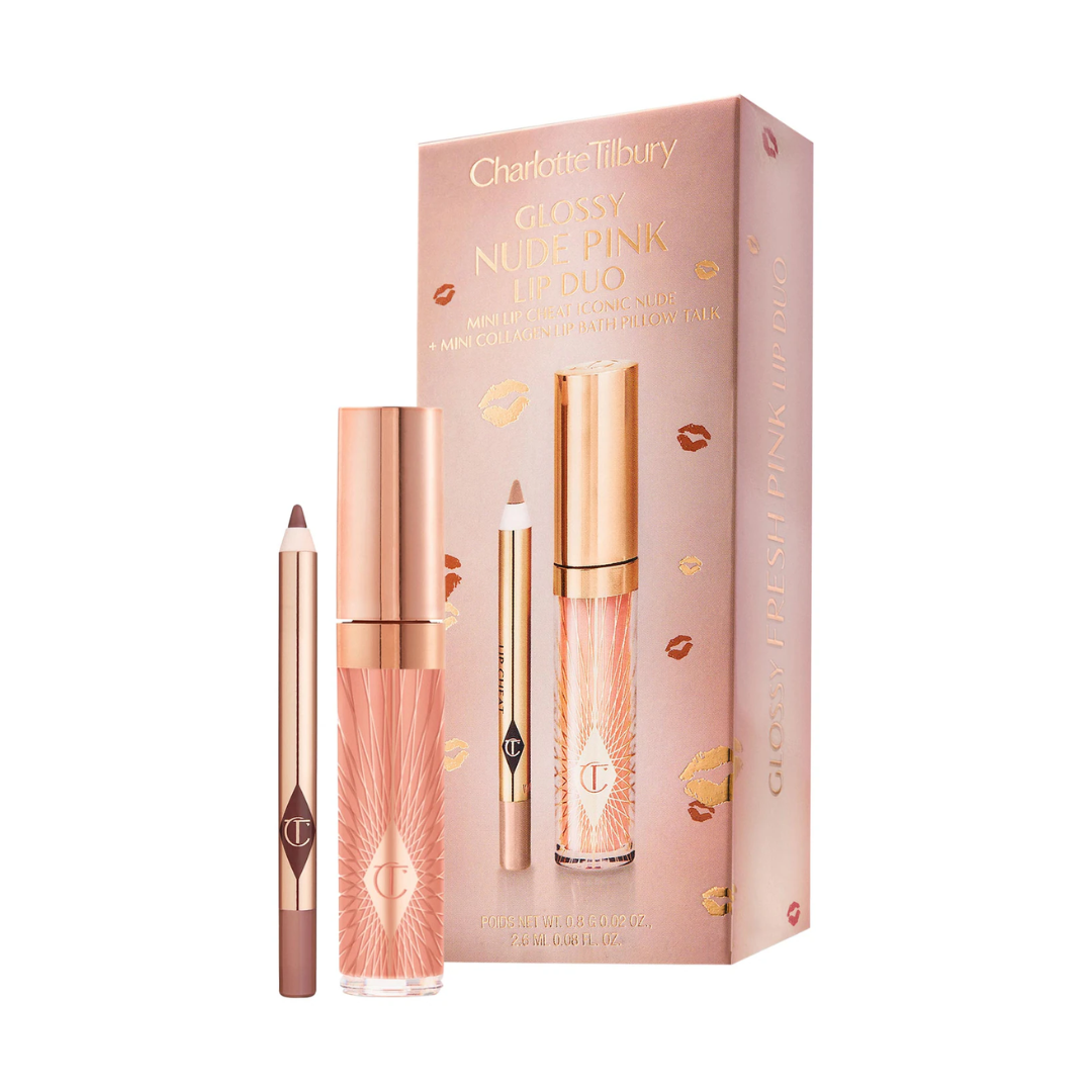 Um conjunto icônico com mini Lip Cheat Lip Liner e Collagen Lip Bath Gloss — a dupla perfeita para lábios contornados, com aparência mais volumosa e acabamento brilhante.